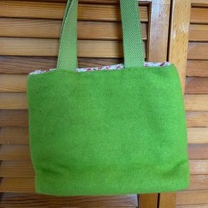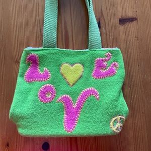Green Wool Shoulder Bag from vintage-inspired British Retailer Past Times. Has 'LOVE' and heart patchwork stitched as decoration.