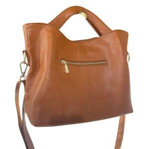 The burnt orange exterior leather bag is a great piece to all to your collection. The medium size bag has a zip closure and features both inner and outer pockets, as well as inner dividers. The shoulder strap is adjustable, and the bag can be worn as a crossbody or over-the-shoulder.