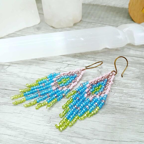 Pastel Beaded Fringe Cascade Dangle Earrings, Boho Chic Statement 3"
