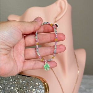 This charming bracelet features a delightful mix of pastel beads and a green clover charm. Perfect for adding a touch of whimsy to any outfit.