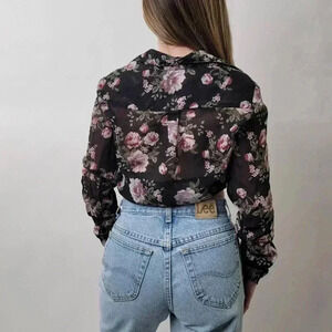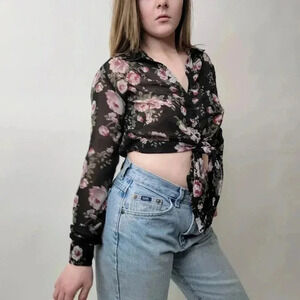 Pastel Black & Pink Floral Mesh Tie Front Coverup Blouse - S