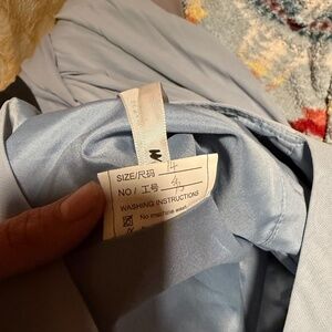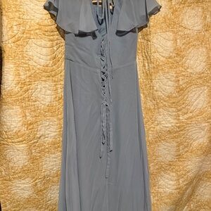 Pastel Blue Dress with corset laces in the back and shoulder strap. Slit to upper thigh, non see-through double layer. Chiffon fabric, floor length.