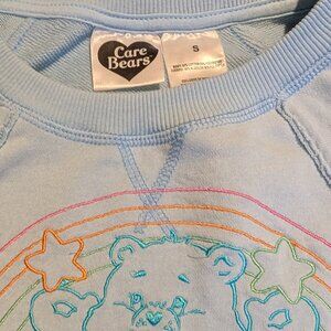 Size small. Cute light pastel blue sweater with care bear design. 45 inches wide and approx. 23 inches long, it's also very stretchy. Worn once, has wrinkles from storage, I did not notice any stains.