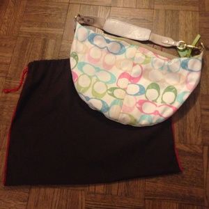 Coach purse - hobo style bag, white base with pastel traditional C pattern and tan lining. Excellent condition, hardly used! Comes with original dust bag and care cards.