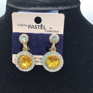 Pastel Collection Crystal & Gold Rhinestone Dangle Drop Clip-On Earrings. New on jewelry card in plastic bag. Will be shipped in a small gift box. * non-pierced.
