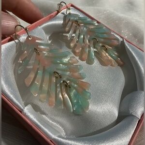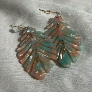 • Design: Statement Cotton Candy fern /leaf-shaped dangle earrings with layered translucent petals in soft pastel hues of mint, peach, and pearl.