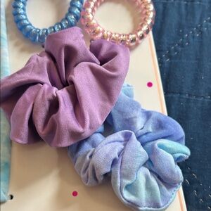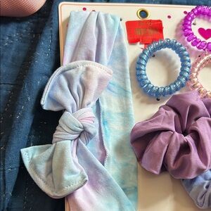 Add a touch of color to your child's outfit with this pastel headwrap and scrunchie set. Featuring soft hues of blue, purple, and pink, this set is perfect for any occasion.