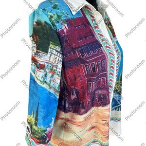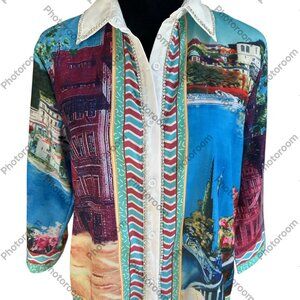 Pastel NWOT Travel Scape Sparkle Button 3/4 Sleeve Blouse Small