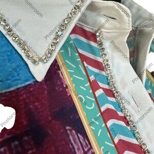 Turn heads with this one-of-a-kind Pastel blouse, featuring a whimsical Europe travel scene print accented with mixed complementary geometric patterns along the front and cuffs. Sparkling rhinestones outline the collar and run down the button placket, adding a touch of glamour to an already eye-catching design.