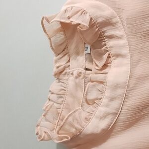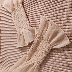 Pastel Pink Puff Sheer Ruffled Sleeve Sweater with Ruffled Neckline