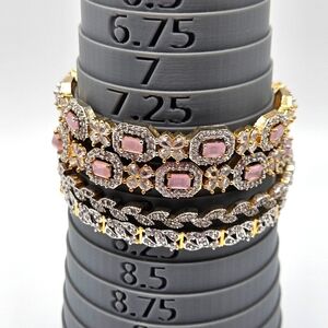 Set of four bangle bracelets. Gold-tone hardware with pink and white rhinestones. Perfect to mix and match or wear alone. Round shape. Size varies between 7.5-8.25". No visible maker's mark. Excellent condition and smoke-free home.
