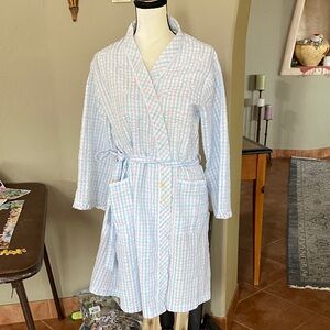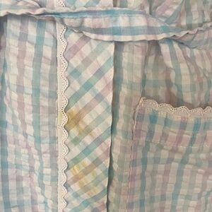 Cozy pastel plaid robe with a tie belt. Features a soft and comfortable design. Does have a small coffee stain on the right ribbing. Spring or summer robe.