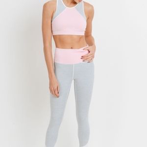 This pastel color block racerback sports bra is crafted out of light pink panel, black-white stripe fabric, and white accent. Perfect for a pastel kind of day.