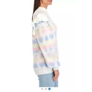 Adorable pastel hearts sweater with ruffled shoulders by Crown and Ivy. Lantern sleeves gives this knit wonder a romantic and unique silhouette.