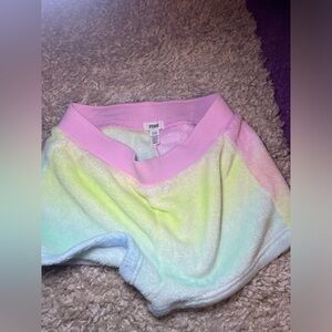 Vibrant pastel tie-dye shorts with a comfortable fit. Features a blend of pink, yellow, and blue hues.