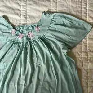 Pale blue floral nightgown. Flutter sleeves. Previous owner cut nightgown shorter so it has a raw hemline. One minor stain in back. No tags.