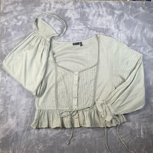 Pretty pastel sage green cotton peasant top made by Asos. Full blouson sleeves that tie at the wrist, lots of pintuck and ruffle details. Buttons down front. Size 12 (XL). Excellent condition. Sweetheart neckline. Super lightweight 100% cotton. Excellent condition.