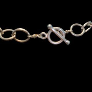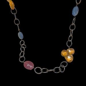 This cute necklace is in excellent pre-owned condition. It's silver metal with pink, blue, and yellow glass beads throughout. It has a toggle closure and is long enough to double up into a choker (maybe). It's approximately 34" long.