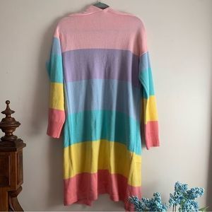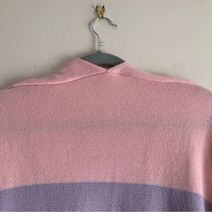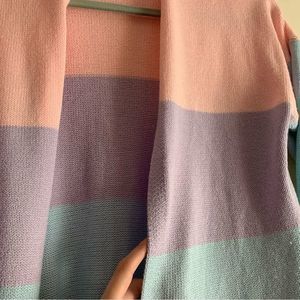 No flaws! Soft. Wide pastel stripes and an open front (no buttons or closures). Not sure what the brand is. One size so listing under size medium.