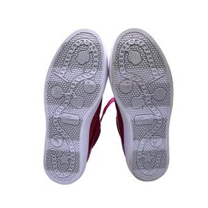 Shiny pink athletic shoes. High-top design. Lace-up closure.