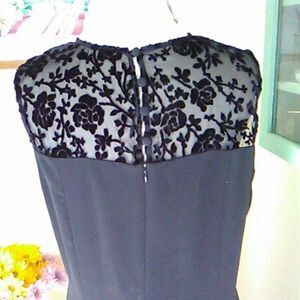 Vintage. Classic black maxi sheath evening dress. Crepe like fabric. Burnt out velvet on sheer at shoulders. Back zip, covered buttons to close. Seaming for fit front and back. Size 16 measures 40 at chest, 36 at waist, 44 at hips, 17 inch slit on left front. 52 long from shoulder to hem. Beautiful forever, classic and elegant.