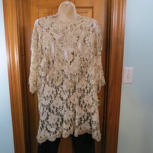 Pat Dahnke Ivory/Tan Lace Cardigan Kimono Beaded Texas Luxury