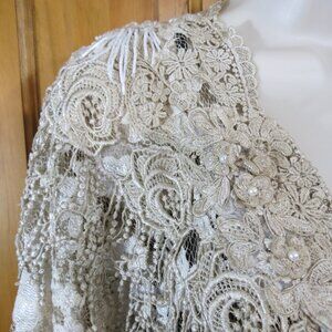 Lace has been dyed a vintage ivory color. The fringe looks like droplets of lace. Shoulders have epaulettes of bead fringe and sequins. Neutral color is great to go with your favorite jeans or dress it up for a night out. This piece is constructed beautifully.