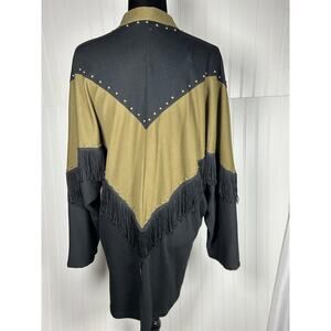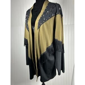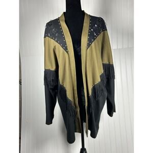 Vtg Pat & Janet 80’s long Cardigan embroidered beaded western Tassels Stud black green Sz M Thelma and Louise vibes