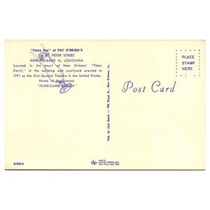 Unposted postcard from Pat O’Briens. Located in the heart of New Orleans.