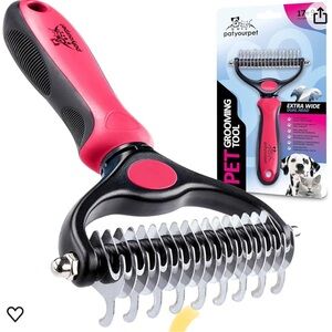 The Patyourpet Double-Sided Deshedding Brush is a pink undercoat rake suitable for dogs and cats. This shedding comb features a wide design to effectively remove loose fur and reduce shedding.