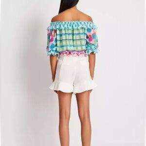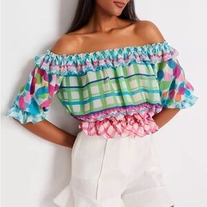 This easy-to-wear off-the-shoulder top features ruched elastic bands at the neckline and waist band that allows you to adjust the fit to make it more or less cropped. Ruffle detail around the top edge of the top. Elbow-length sleeves also feature ruffles and ruched elastic on the cuffs. Lightweight, semi-sheer chiffon fabric in our original Antibes Print. Top is unlined.
