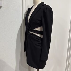 PatBO Cutout Blazer Mini Dress in size 6. Blazer but make it Haute, this menswear-inspired mini features sexy waist cutouts that take this mini by PatBO to another level. This elegant black dress features stylish cut-out details, perfect for a night out. Its sophisticated design ensures you stand out with confidence. Black ponte (96% Polyester, 4% Elastane). Lining (95% Polyester, 5% Elastane) Sheath. Long sleeves. V-neck. Back zipper closure. Normal signs of wear and use. No notable flaws. Please refer to photos for exact size, details, and condition.