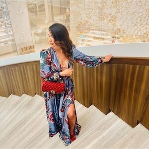 PatBO Dress Gilly Print Cut-Out Maxi Floral Open Back Slit Vacation Blue 8 NWT