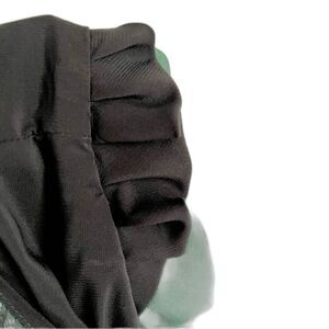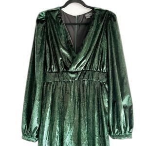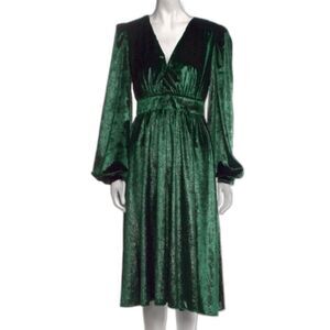 Excellent condition worn once without signs of wear. Gorgeous dress with slightly puffed sleeves- looks very elegant and feminine while the deep v-neck shows the perfect neckline. Fabric is a lovely, plush Metallic green “liquid” velvet. Long sleeves. V-neckline (no closure).