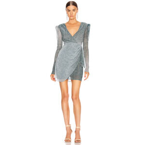 PatBO Lurex Mini Dress in Metallic Ombre Blue. Features mini length silhouette, lightweight lurex fabric, sheer long sleeves, ombre effect coloring, metallic threading throughout, draped ruffle waist detail, lightly structured shoulders, ruched mini skirt, fully lined, hidden back zip. 96% polyester, 4% elastane. Great used condition, no notable flaws. Style number VES2070CUS