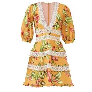 Yellow and white crepe (98% Polyester, 2% Elastane). Hourglass. Three quarter sleeves. V-neckline. Back zipper closure. Fully lined. 34.5" from shoulder to hemline.