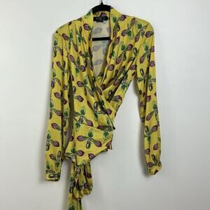 Vibrant yellow wrap blouse. Features floral print. Long sleeves with tie waist. Elegant and stylish.