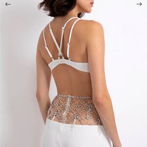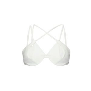 This sophisticated cropped top features molded cups with criss-crossing shoulder straps. Adjustable straps. Fabric-covered button closure. Fully lined. Runs true to size. Model is wearing a size 4.