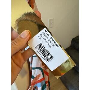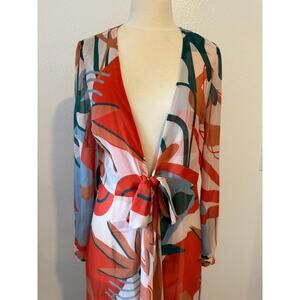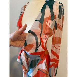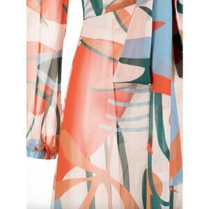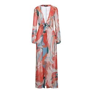 Orange/multicolour abstract pattern print V-neck long sleeves front tie fastening