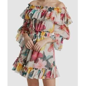 PatBo Ruffle Pink Floral Hibiscus Off Shoulder Mini Dress Size Small