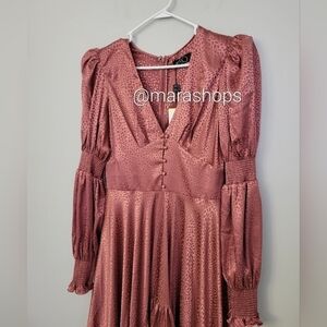 Glossy midi design with baroque poet sleeves for a romantic feel.
