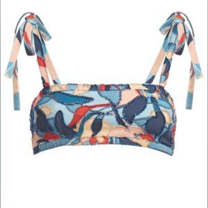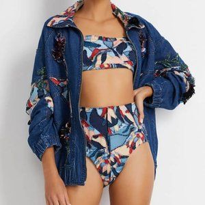 Printed hand-sewn denim cropped top. Exposed back zipper and adjustable shoulder ties. Runs true to size. Model is wearing a size small.