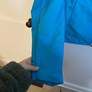 Pre owned overall excellent condition. There are two minor flaws - a small spot on one of the arms (pictured) and a hole on inside of one pocket (pictured). There was also a glare from the sun when photographing so that is what is visible in the first and second photos. Size was removed but this looks like a medium. Length 25” Armpit to armpit 18.5”