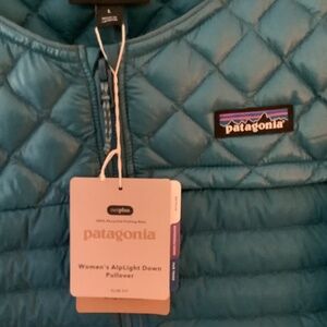 Patagonia AlpLight quilted down filled pullover size large. Half zip. Teal blue. Shell is 100% recycled nylon, lining 90% goose down, 10% waterfowl feathers. Slim fit. Machine wash cold.