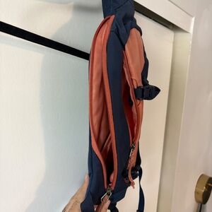 Asymmetrical harness carries weight close to the body for all-day comfort, with a zippered stash pocket on the strap