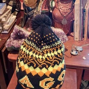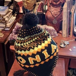 This cool beanie has a pom on top and tassels down the side. It is in nice pre-loved condition and is unisex.