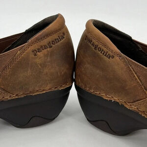 Patagonia Better Leather Slip On Clog in Thatcher Brown - Size 8 1/2. Excellent pre-owned condition. Very clean, little to no wear. Split toe clog featuring shock absorbing demi wedge heels and inset stretch goring at sides. Padded collar. Leather upper with a round toe, rubber outsole for lasting traction and wear. I believe this style has been discontinued.