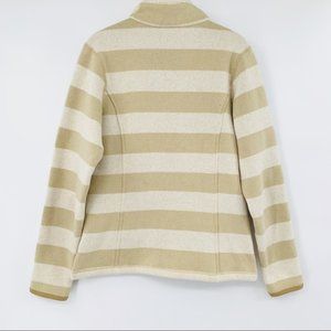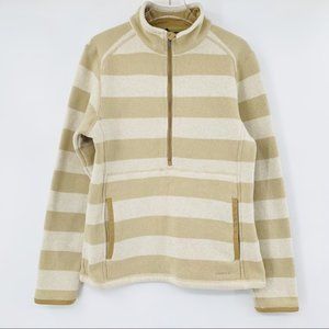 Women’s Patagonia fleece pullover fleece, front and back contour shaping with tan and beige stripes.
