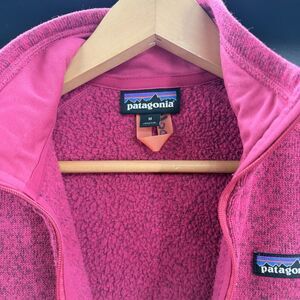 The Patagonia Better Sweater Jacket for women in size medium features a stylish pink color and a cozy fleece fabric, making it perfect for colder weather. This mid-length jacket has a full zip closure, long sleeves, and a mock neck for added warmth. Easy to care for with a machine washable design, this regular fit jacket from the trusted brand Patagonia is ideal for all seasons and can be worn throughout the fall, winter, and even in cooler spring days. Perfect for staying comfortable and stylish in fluctuating weather conditions.