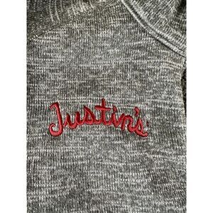 Patagonia Better Sweater Men's 1/4-Zip Pullover Fleece Sweater. Size large. In good used condition. Justin's logo on the right chest. 1/4 zip collar with a zip up pocket next to it. Patagonia logo on the left chest.
